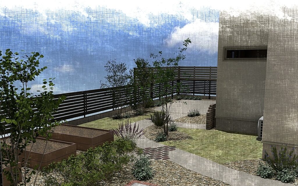 平坦だったお庭を、テラスへと繋がる小道、周りの植栽などで